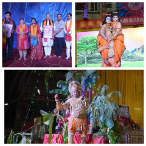 और अक्षय कुमार का वध कर देते हैं,इस बीच मेघनाथ द्वारा ब्रह्माबांस में हनुमान जी को बांधकर रावण के सामने प्रस्तुत किया जाता है।रावण अपने अहंकार वंश हनुमान जी की मति नहीं लेते हुए उन पर क्रोधित होते हुए रावण हनुमान जी की पूंछ में आग लगवा देते हैं।इस जली हुई पूंछ से हनुमान जी पूरी लंका को जला देते हैं।यह लीला बहुत ही सुंदर ढंग से प्रस्तुत की गई।अतिथि के रूप में पहुंचे राज्यसभा सांसद नरेश बंसल ने कहा कि प्रभु श्री राम हमारी आस्था और जीवन संस्कृति के लिए बेहद महत्वपूर्ण है।उनके आदर्श सनातन संस्कृति को हजारों वर्षों से जीवित रखे हुए हैं।इस अवसर पर मेयर अनीता देवी अग्रवाल,वरिष्ठ भाजपा नेता चौधरी धीर सिंह,सतीश कौशिक,प्रमोद चौधरी,ललित मोहन अग्रवाल,प्रमोद गोयल,भाजपा जिला महामंत्री सागर गोयल,गगन आहूजा,पार्षद जेपी शर्मा,चंद्र प्रकाश बाटा,डॉ०नवनीत शर्मा,रमेश जोशी,अनुराग त्यागी हनीश शर्मा,समिति के महामंत्री सौरभ सिंघल,मनोज अग्रवाल,शशिकांत अग्रवाल,विशाल गुप्ता,नवनीत गर्ग,प्रदीप परूथी,दीपक शुक्ला सहित बड़ी संख्या में भक्तगण मौजूद रहे,इस दौरान समिति के पदाधिकारियों द्वारा अतिथिगण का सम्मान किया गया।