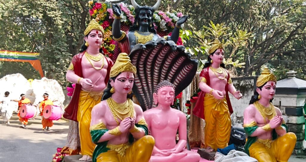 पंचकल्याणक प्रतिष्ठा महोत्सव के तीसरे दिन तीर्थंकर भगवान के जन्मोत्सव पर नगर में जैन समाज द्वारा भगवान की निकाली गई भव्य शोभा यात्रा